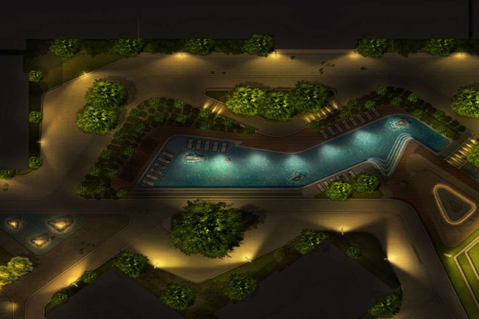 Olympic-Sized Swimming Pool: A large swimming pool caters to both leisure and fitness needs, providing a space for relaxation and exercise.