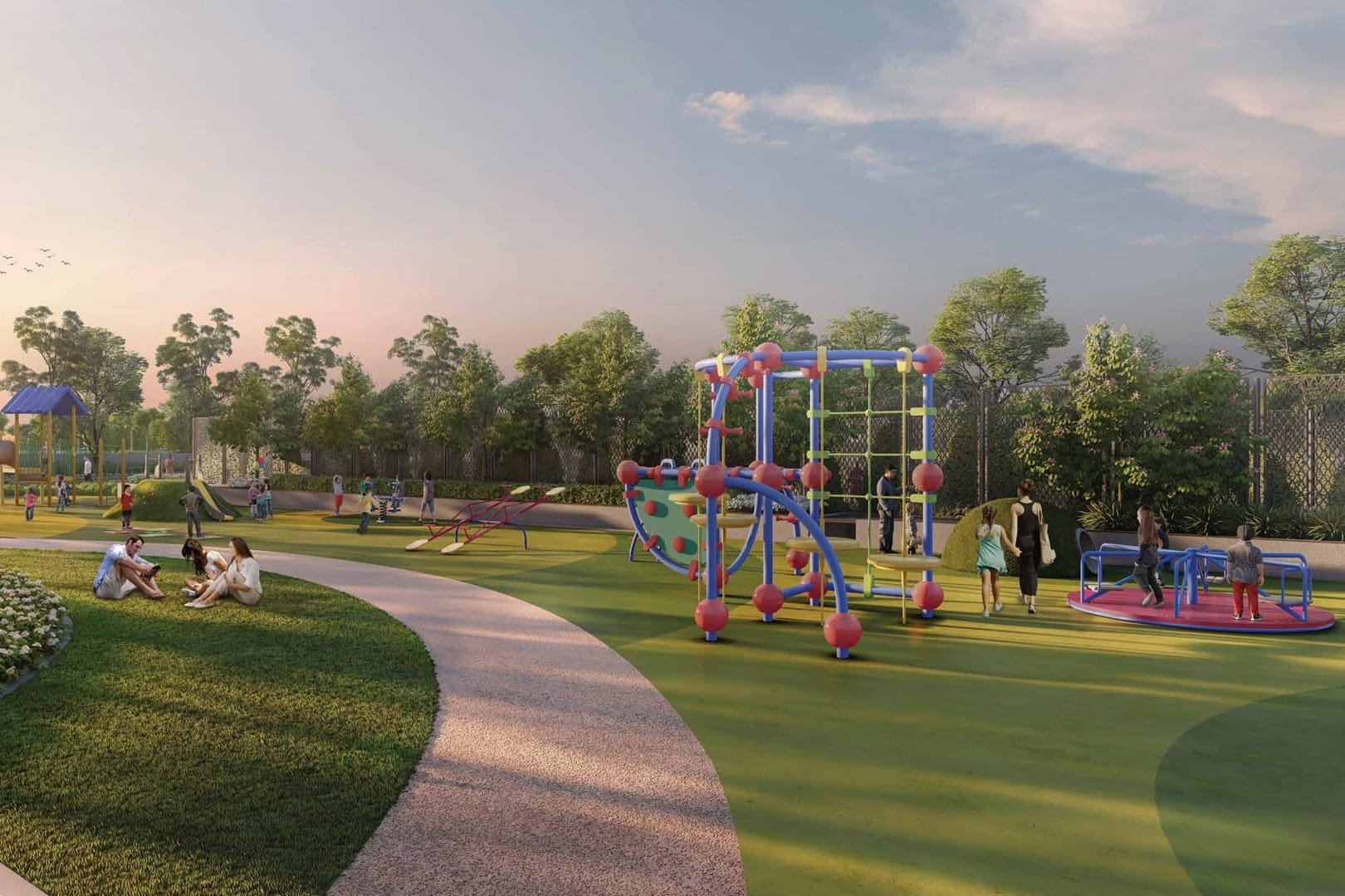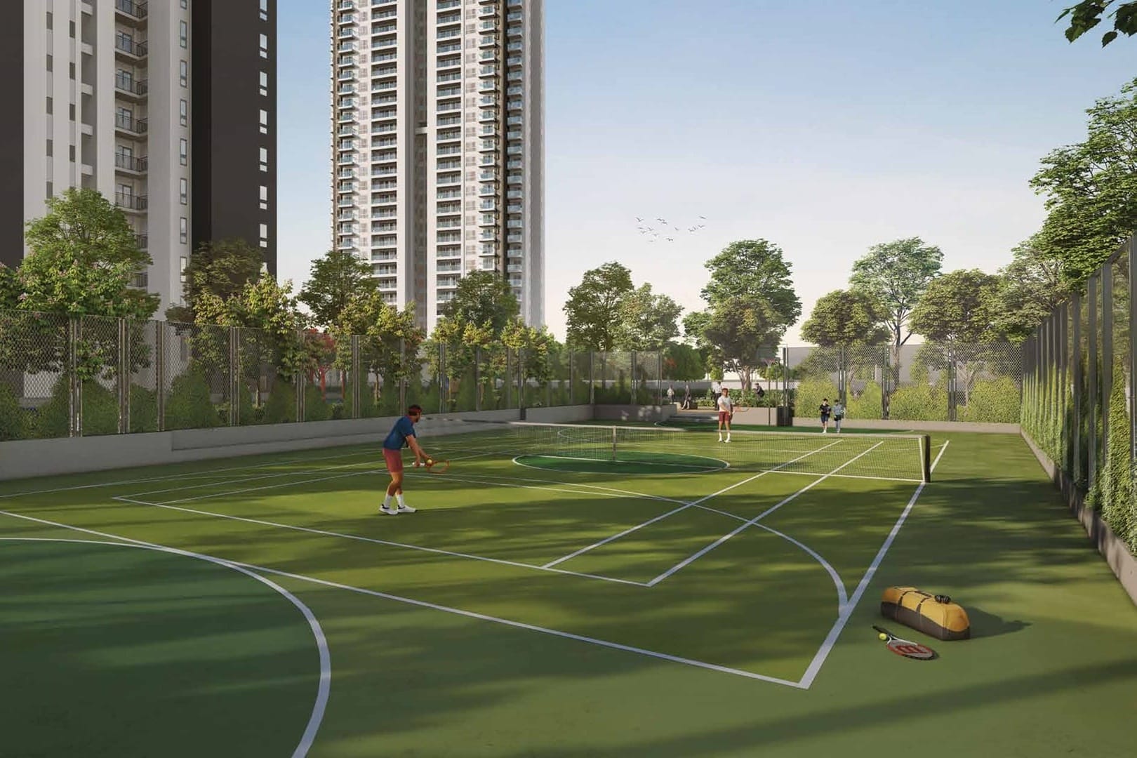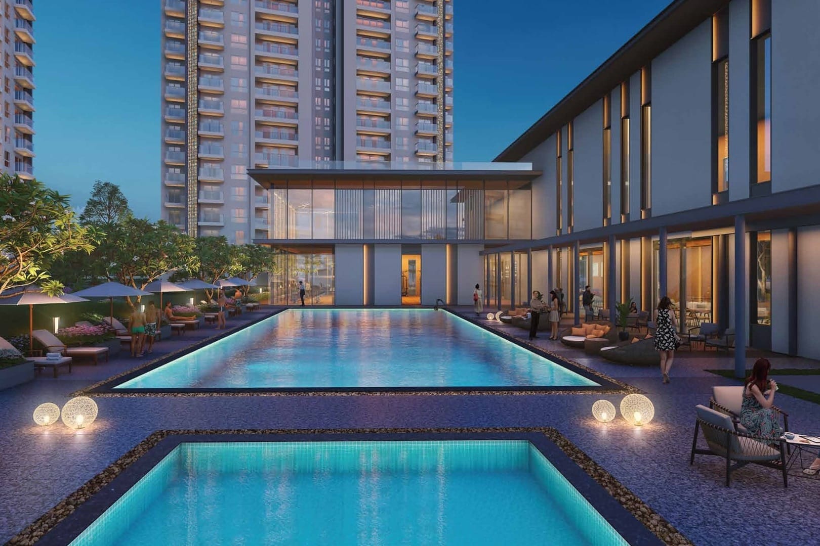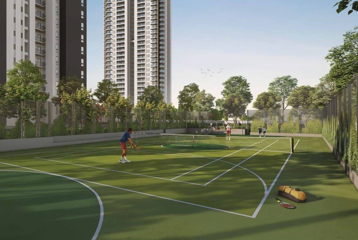 Residents have access to a gymnasium, infinity-edge swimming pool, jogging tracks, landscaped gardens, and sports courts.