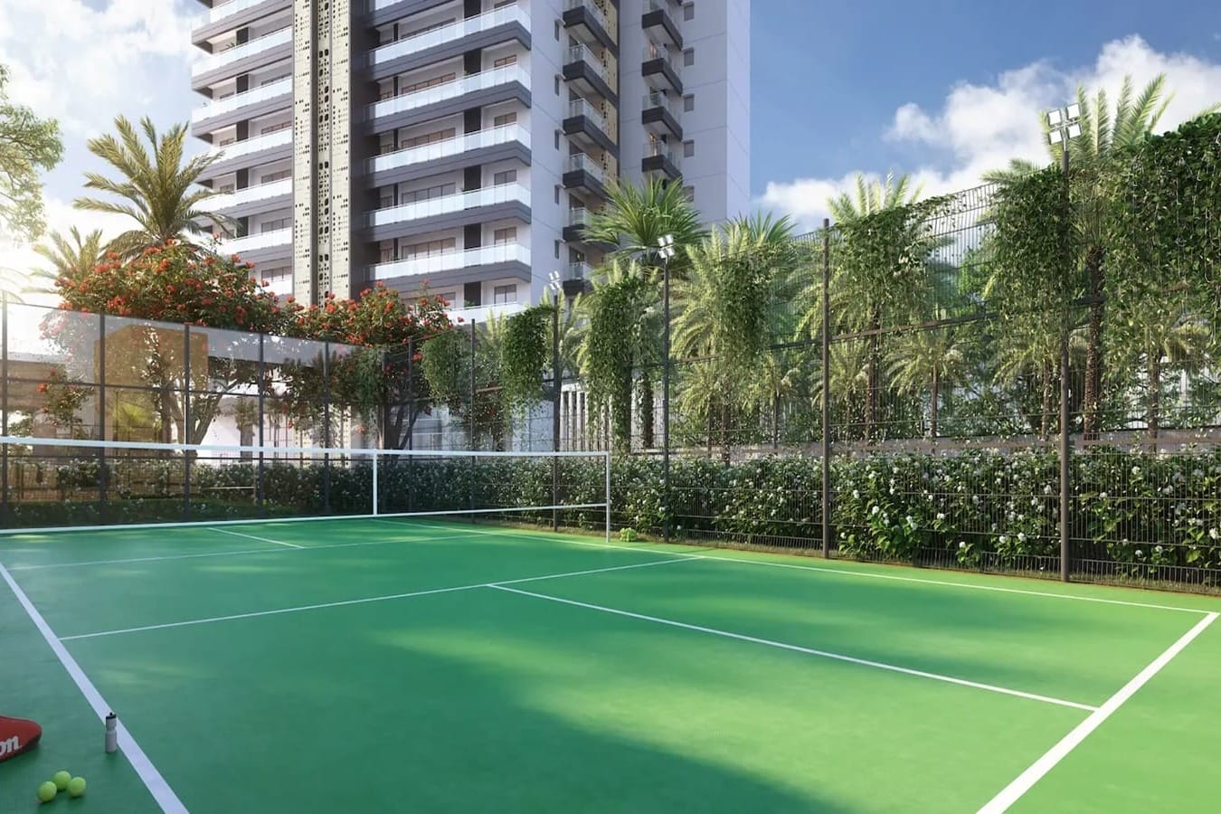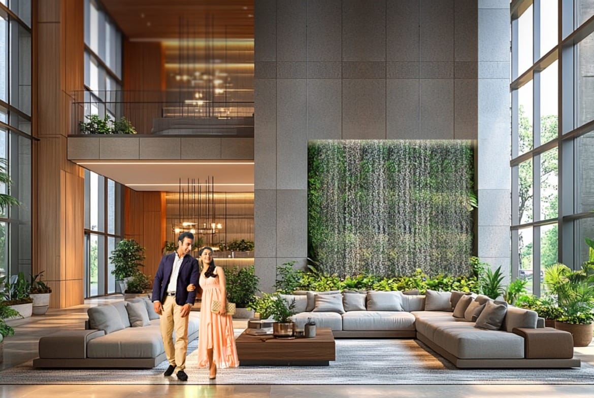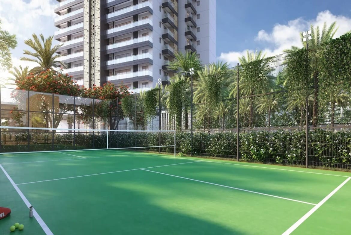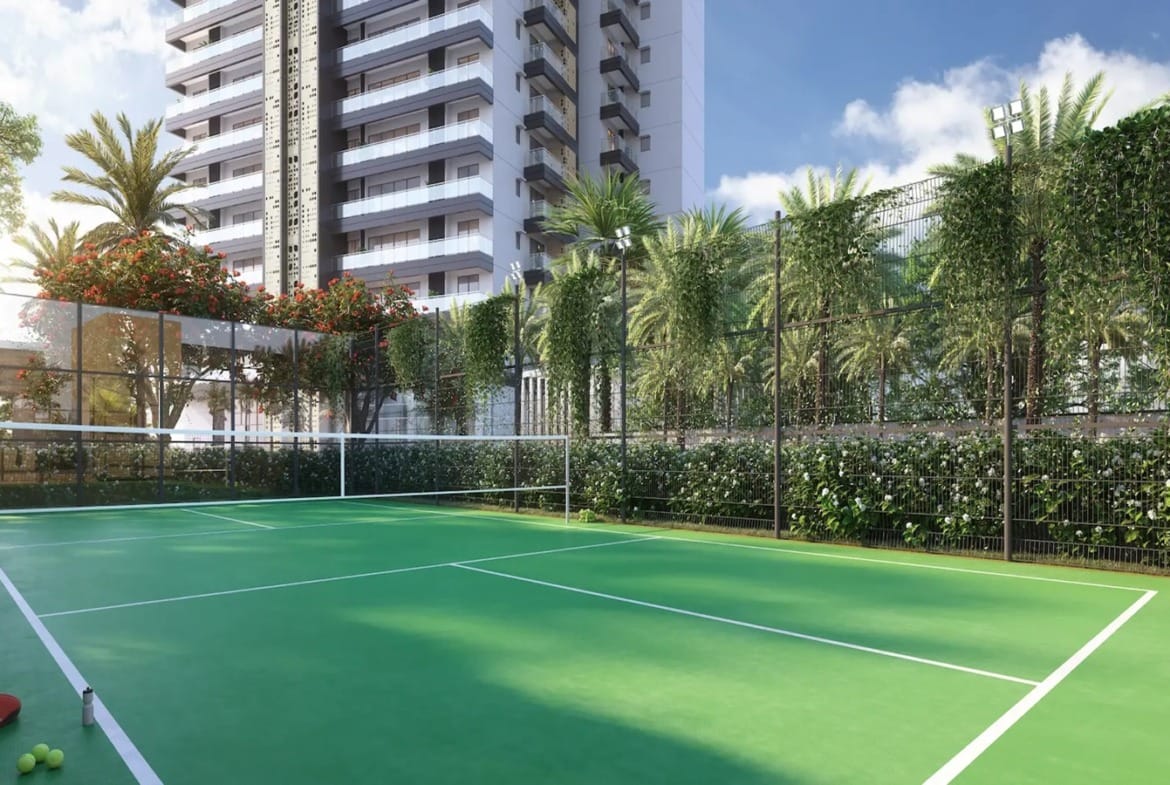 Residents enjoy a 15,000 sq.ft. clubhouse, sports courts, wellness spaces, landscaped gardens, water features, and indoor-outdoor recreation areas.