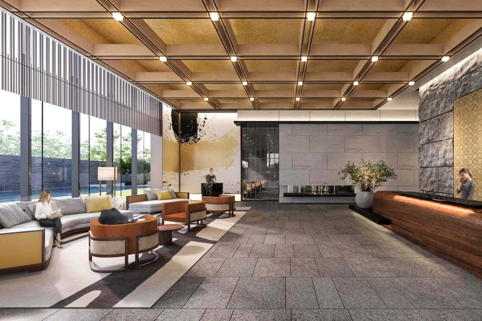 The Planting zones follow the landscape design on the ground, with organic lines and natural elements such as Black Granite and Lush Greenery