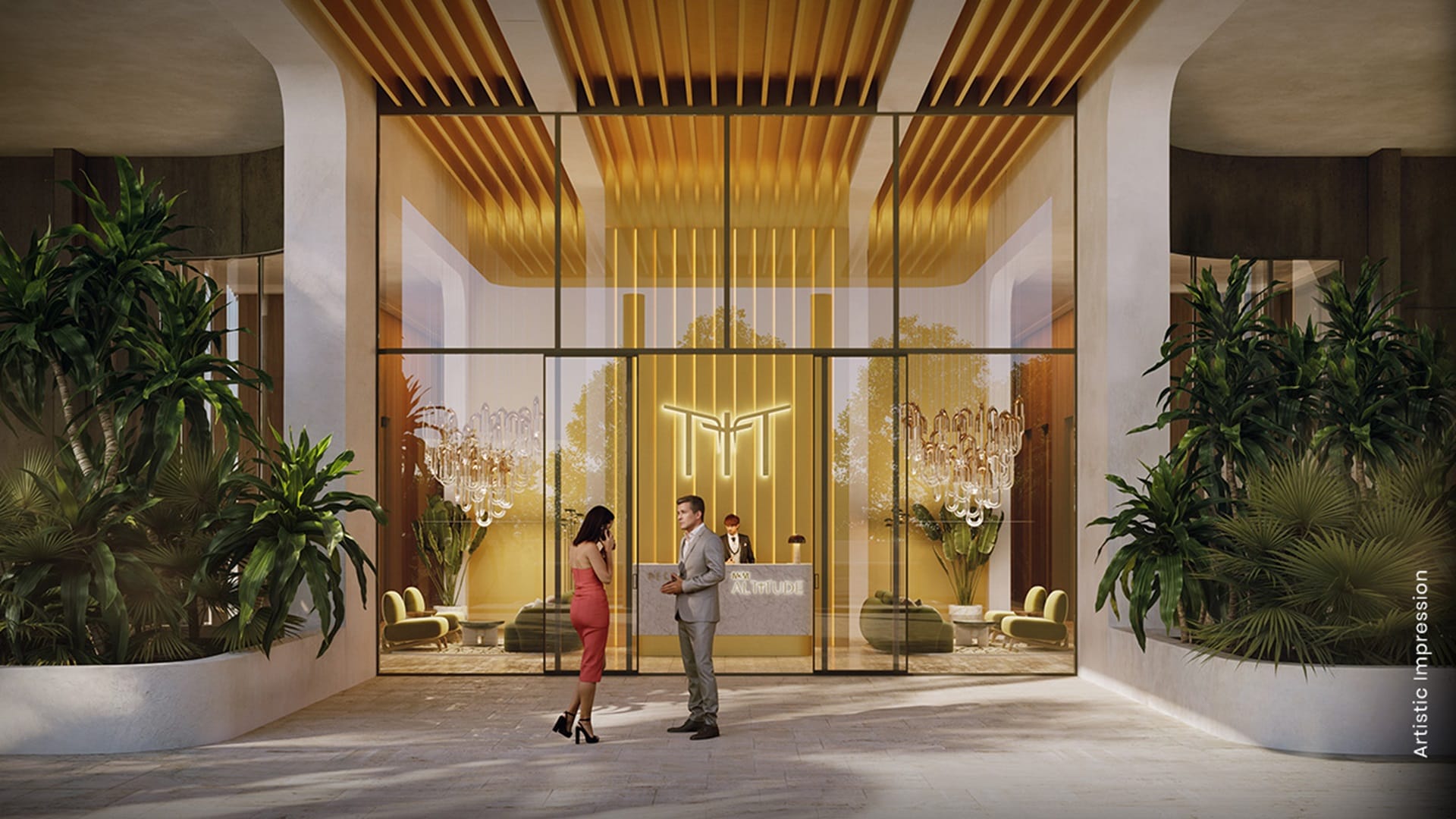 Majestic lobby with ceilings three times the standard height, embodying a grand entrance.