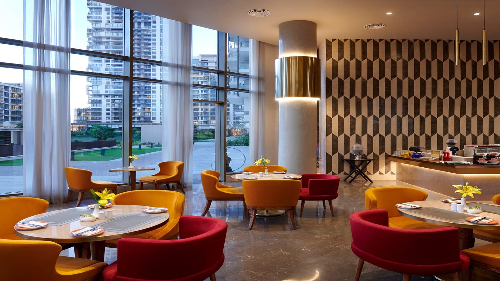 views of the bustling city life on one side and the Aravalli range on the other.
