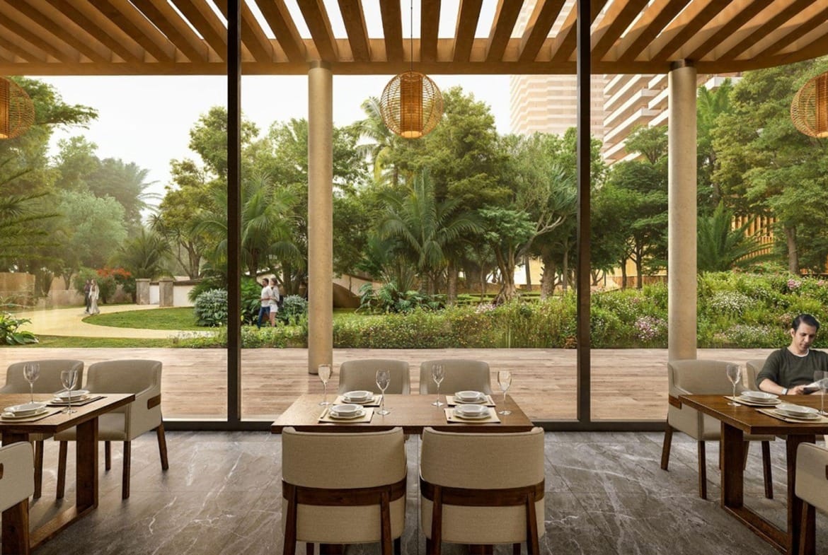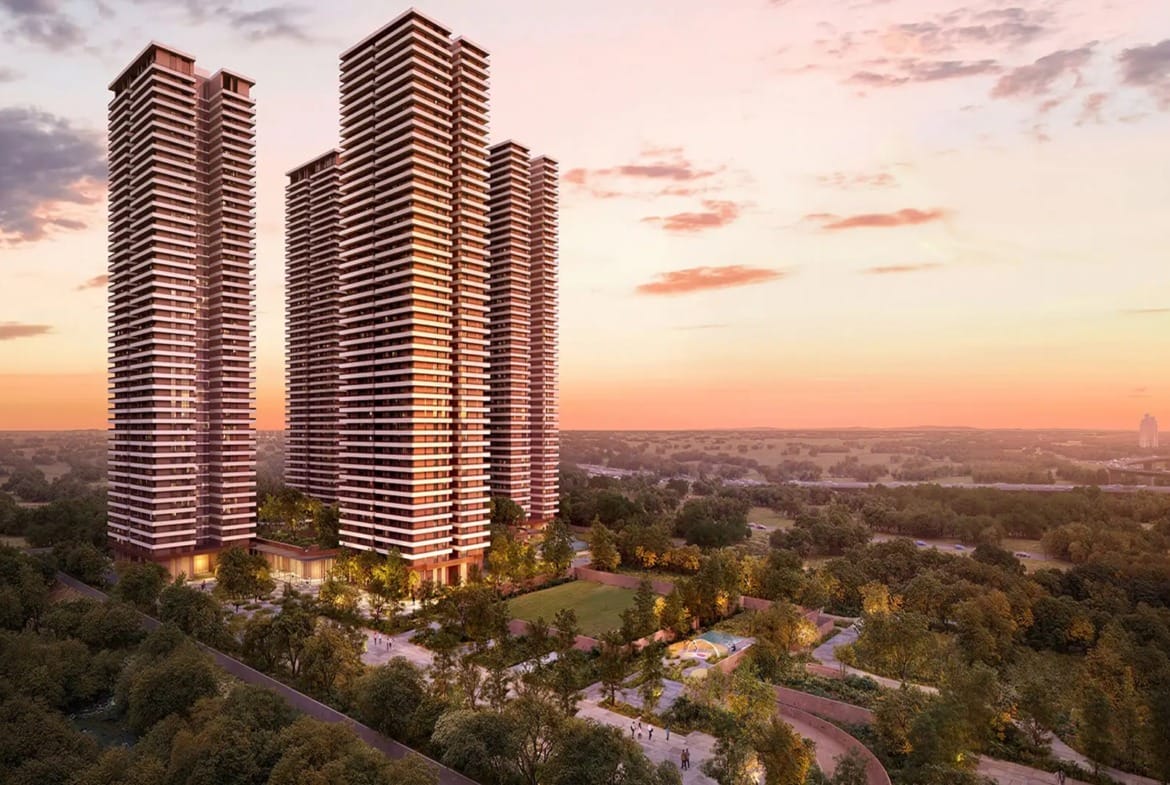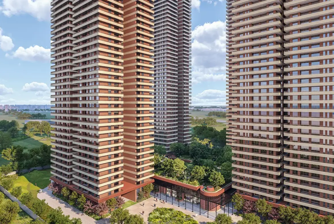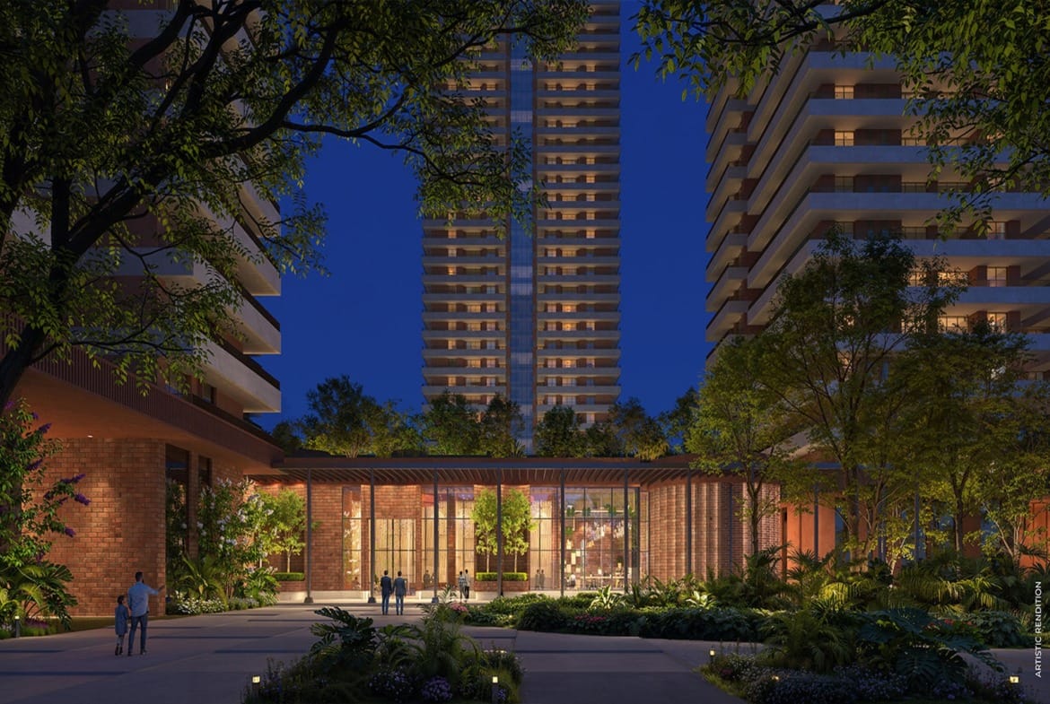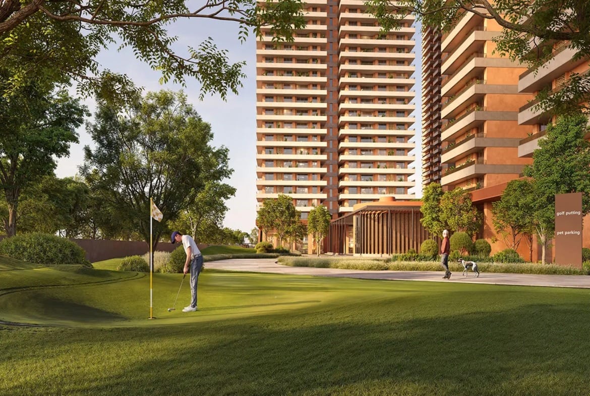 The project includes a grand clubhouse, rooftop courtyards, sports facilities, wellness clinics, spa, children’s zones, retail spaces, business centres, and extensive green landscapes.