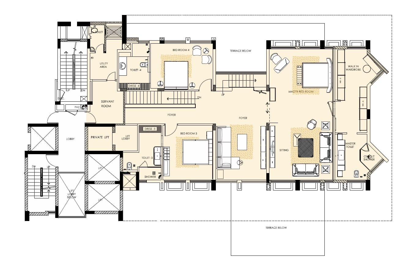 The contemporary architecture of the penthouses create an abundance of space, offering a floor plan rarely seen in modern developments, meeting every demand of contemporary living. Be it the rooftop terrace or the floorto- ceiling windows, they maximize stunning vistas across the complex and the Gurugram skyline.