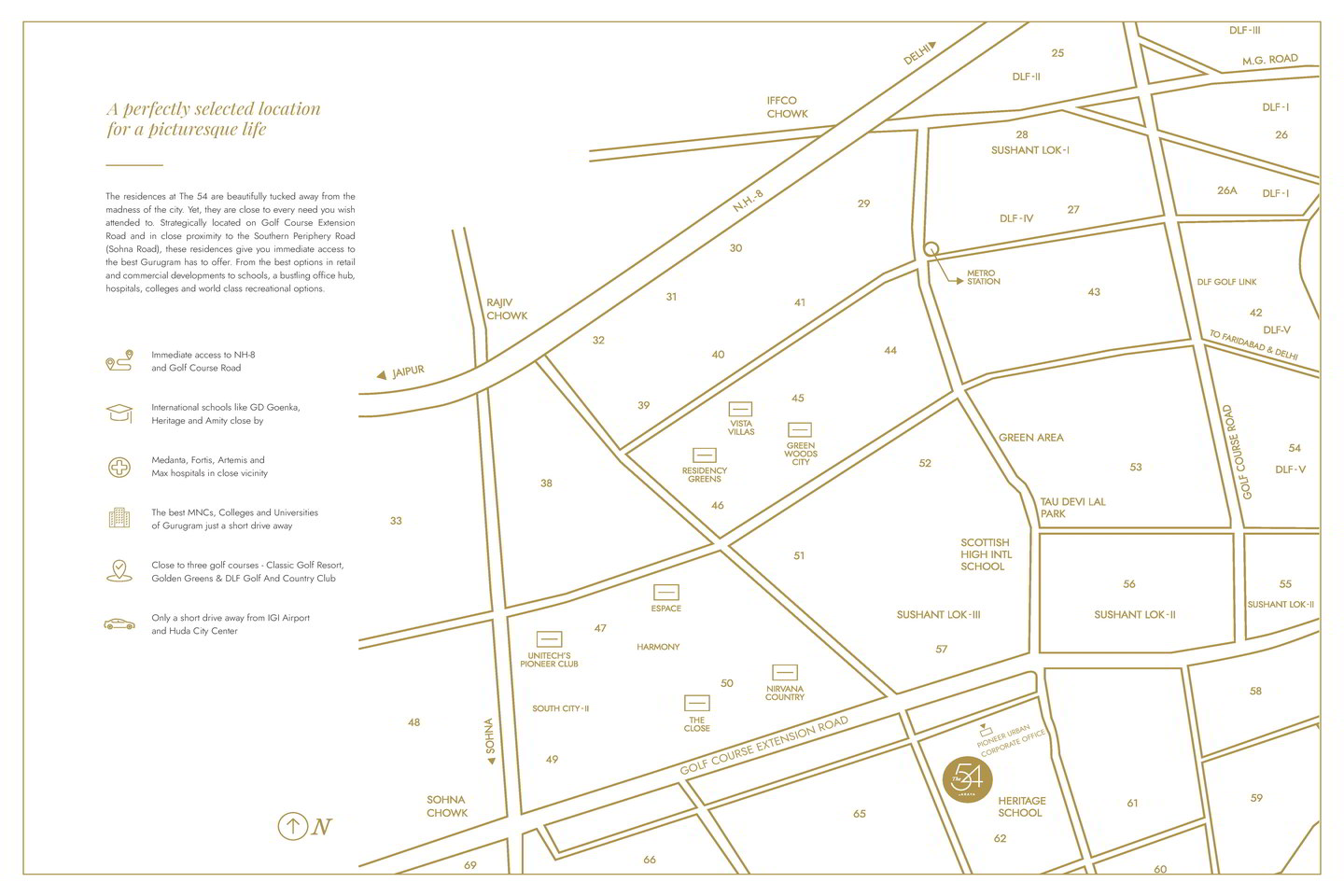The residences at The 54 are beautifully tucked away from the madness of the city. Yet, they are close to every need you wish attended to. Strategically located on Golf Course Extension Road and in close proximity to the Southern Periphery Road (Sohna Road), these residences give you immediate access to the best Gurugram has to offer. From the best options in retail and commercial developments to schools, a bustling office hub, hospitals, colleges and world-class recreational options.