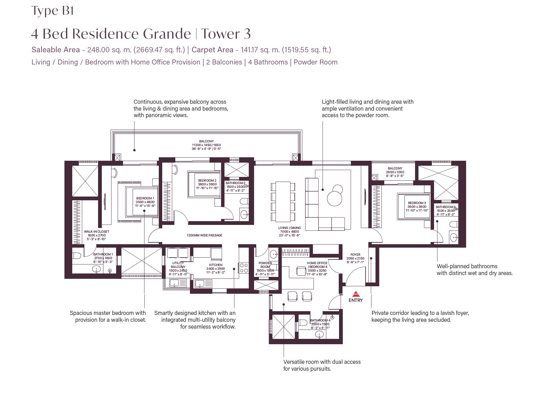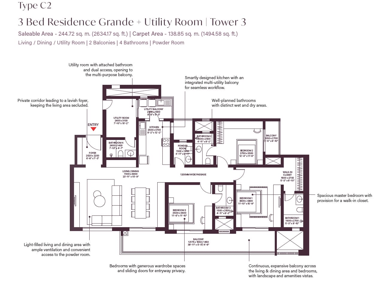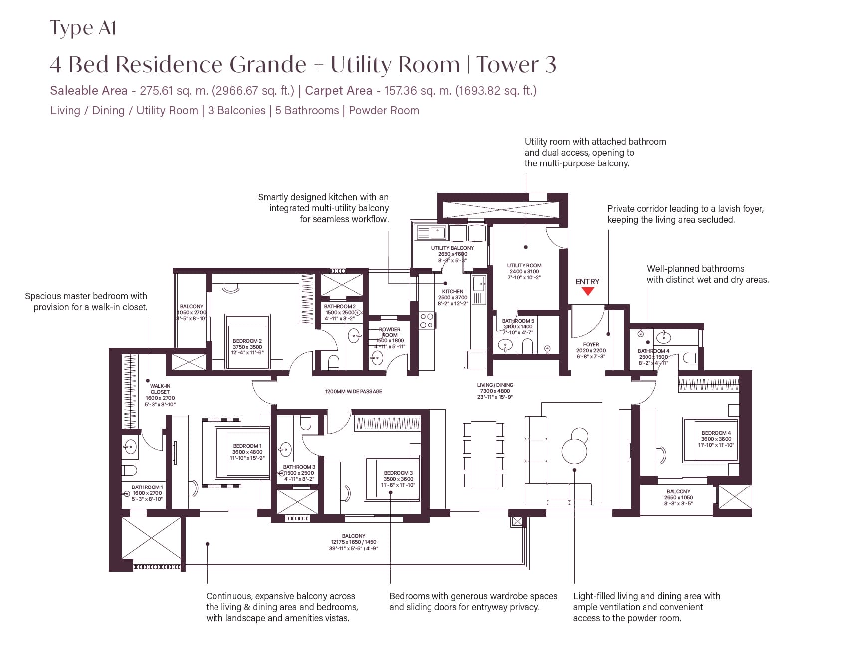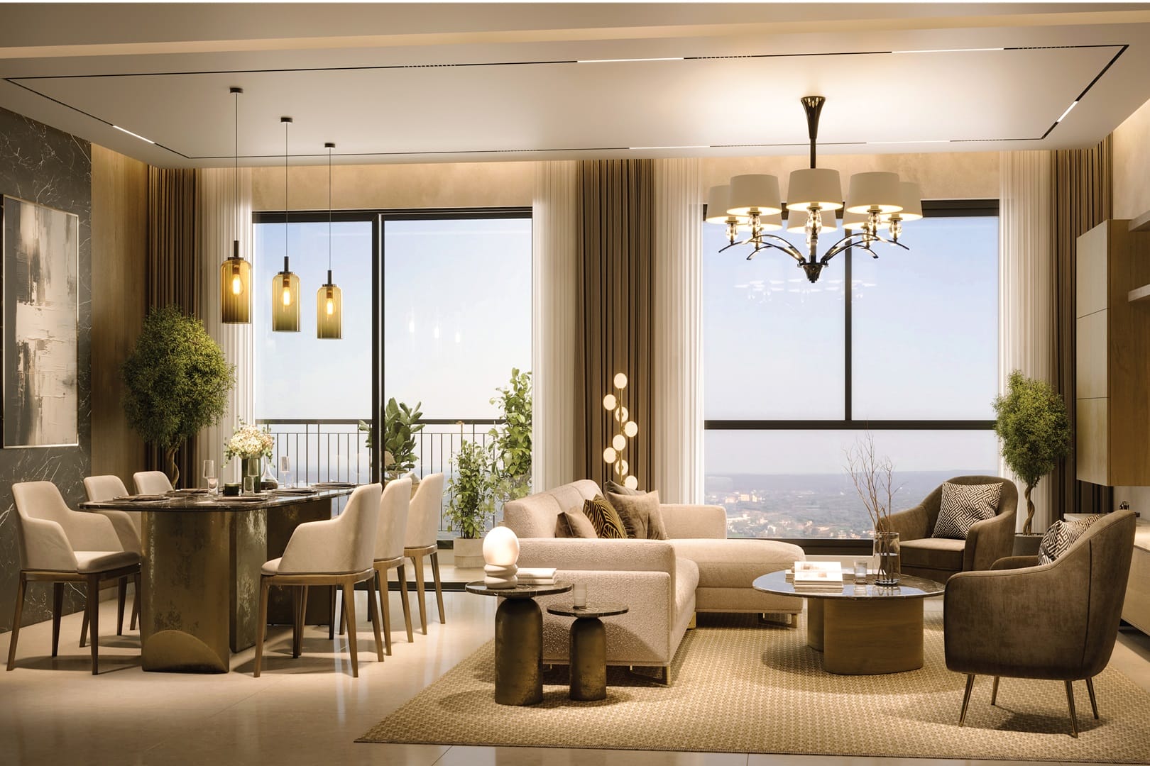 Each tower rises to 3 basements + ground + 42 floors, offering panoramic views and vertical luxury living. The residences are available in:
